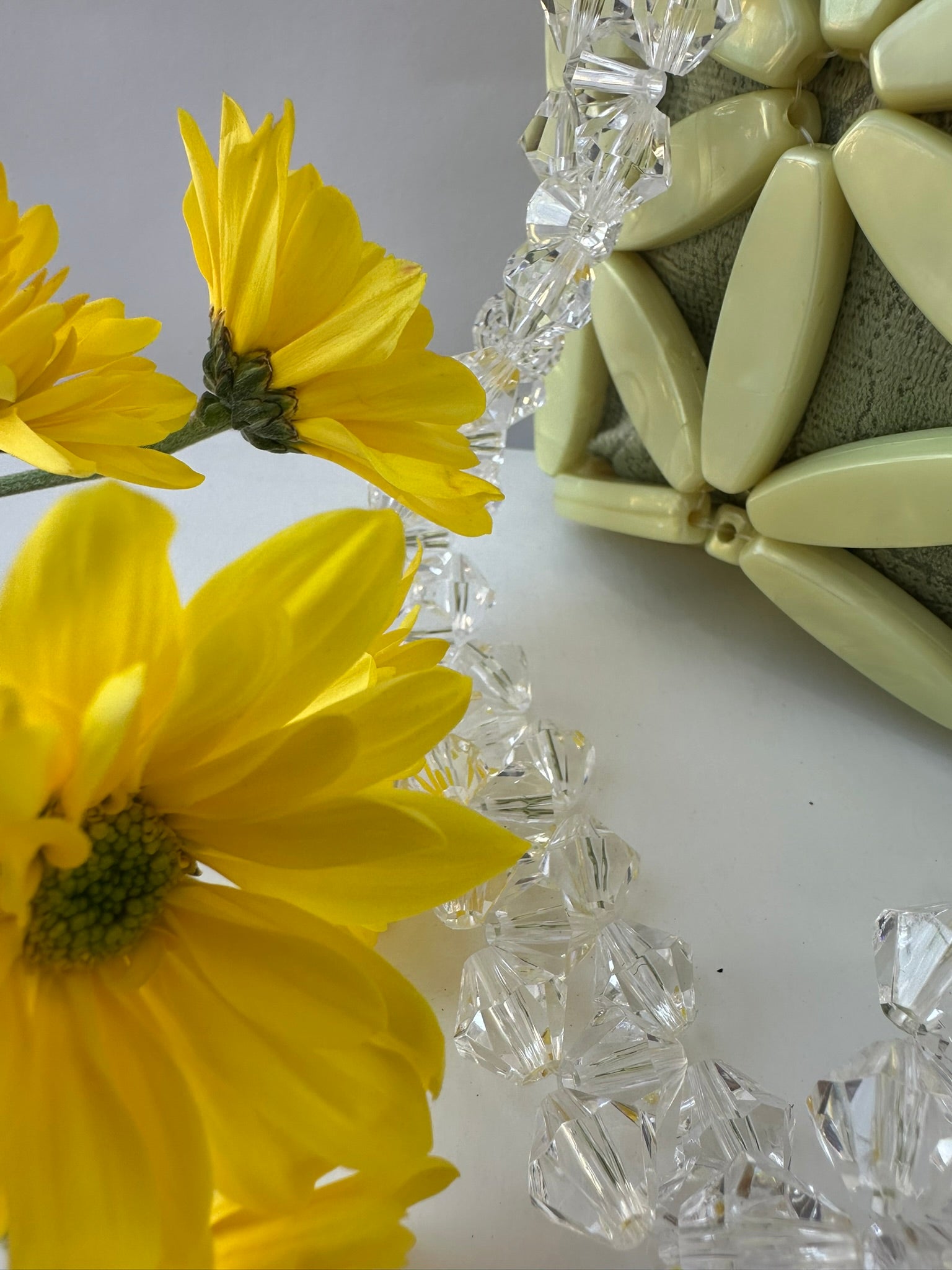 Bolso tejido a mano con cuentas acrílicas en forma de flor. Tiene un bolso de tela interno, fijo y con cierre.