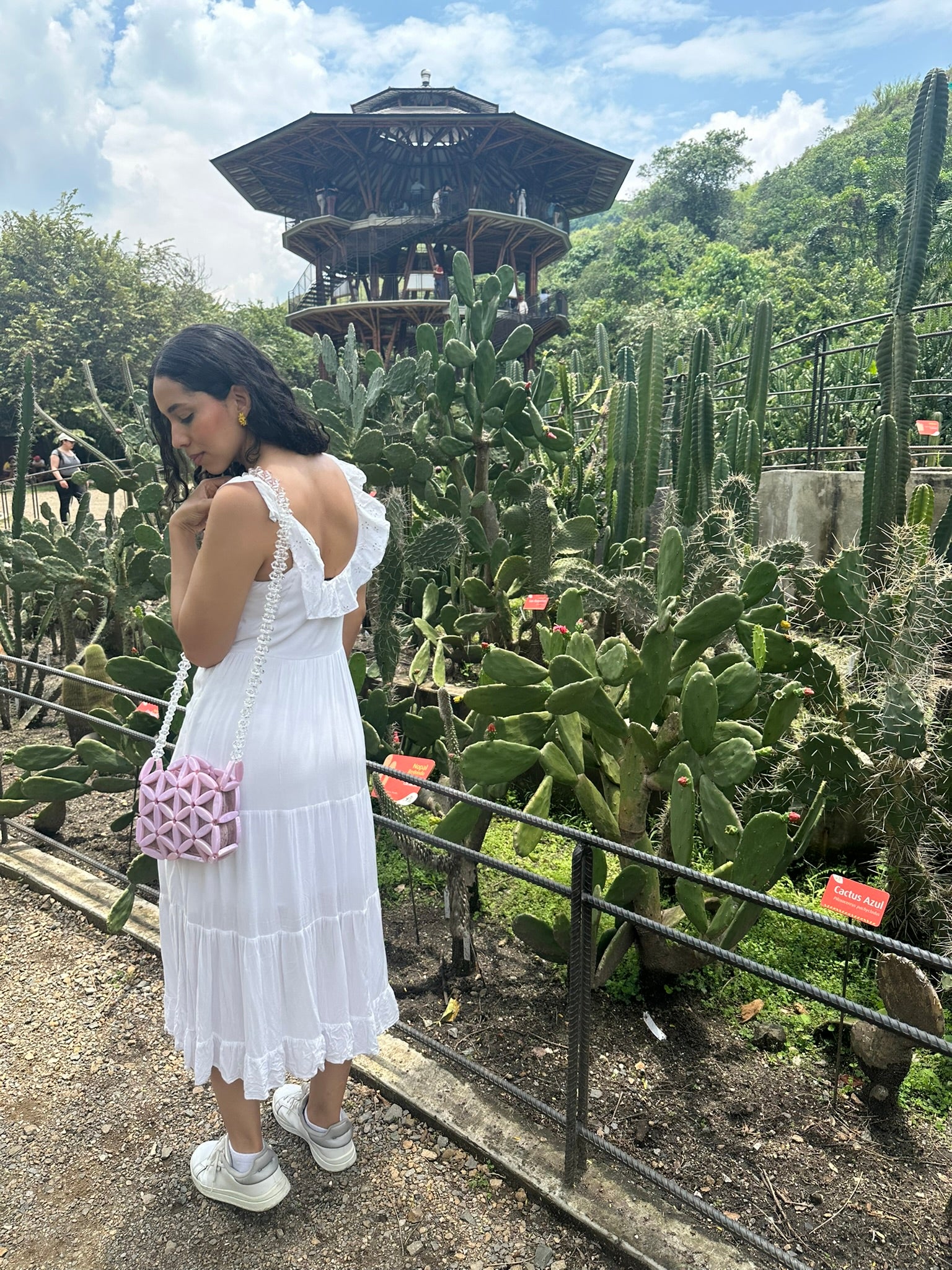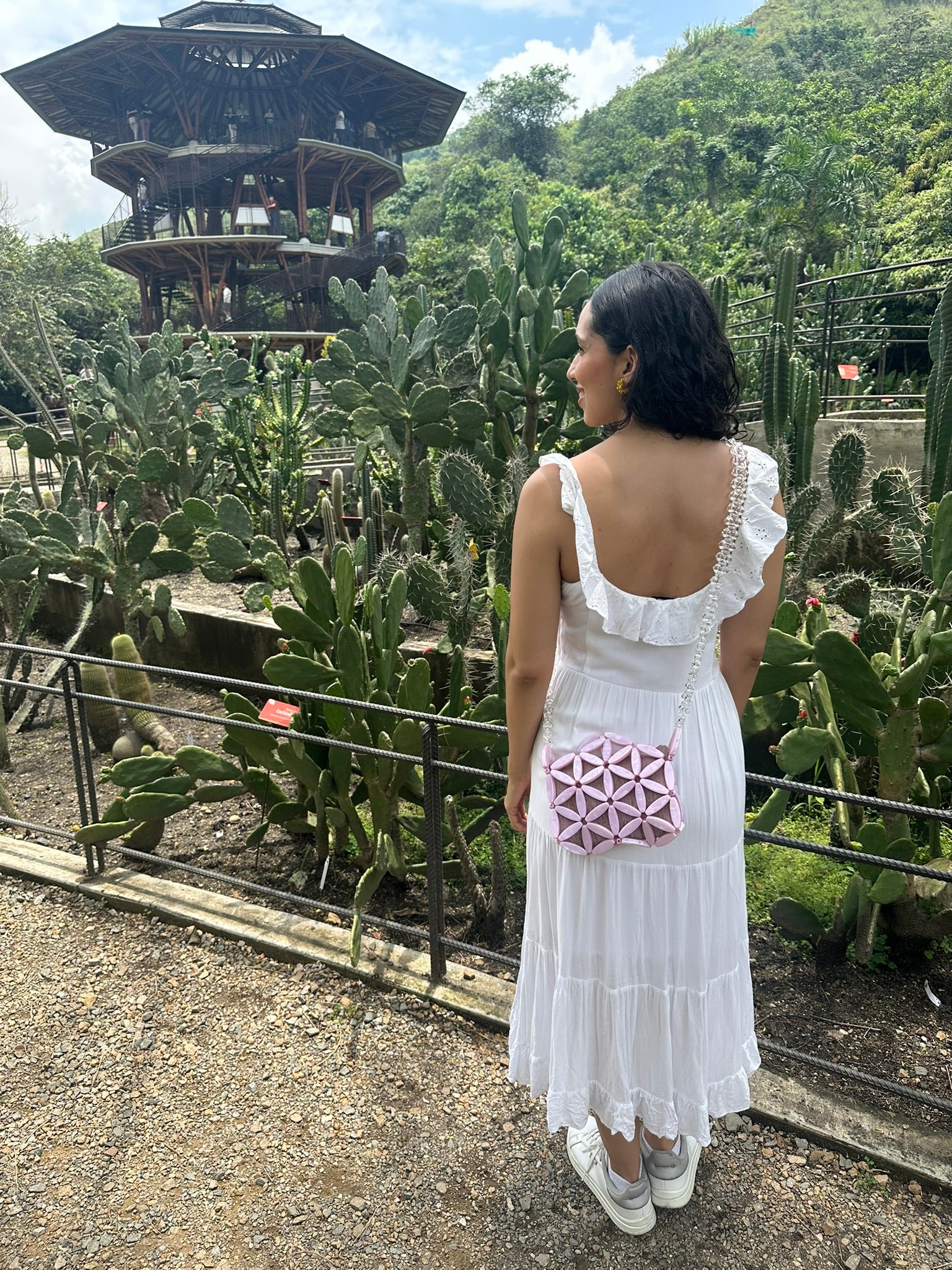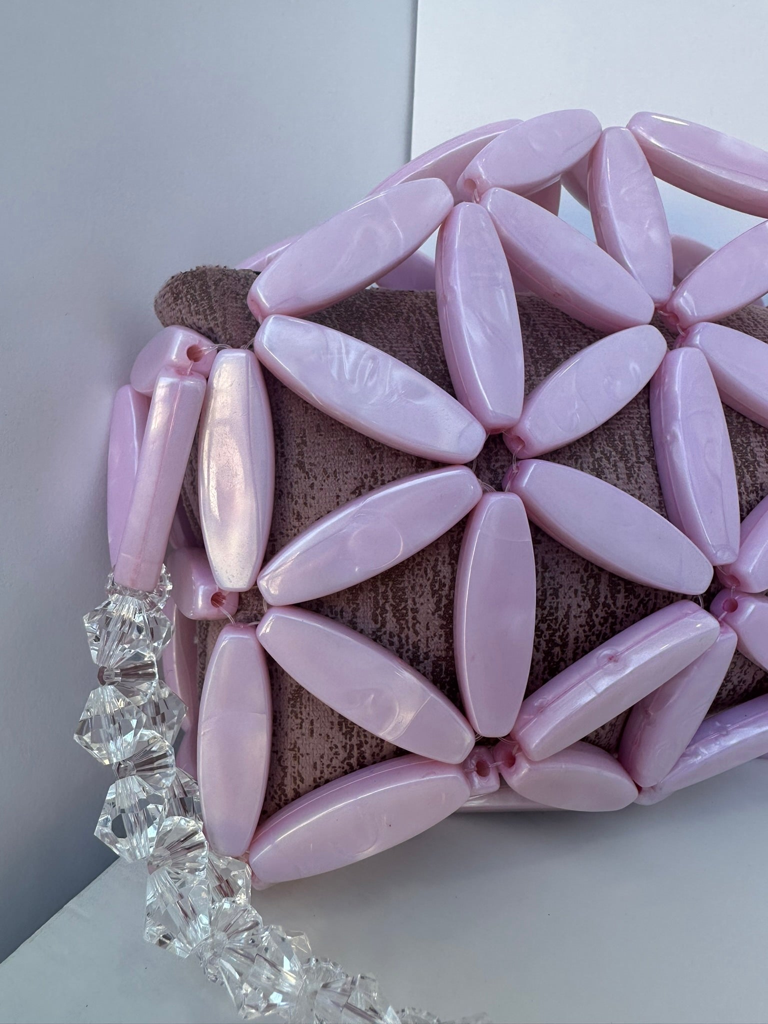 Bolso tejido a mano con cuentas acrílicas en forma de flor. Tiene un bolso de tela interno, fijo y con cierre.