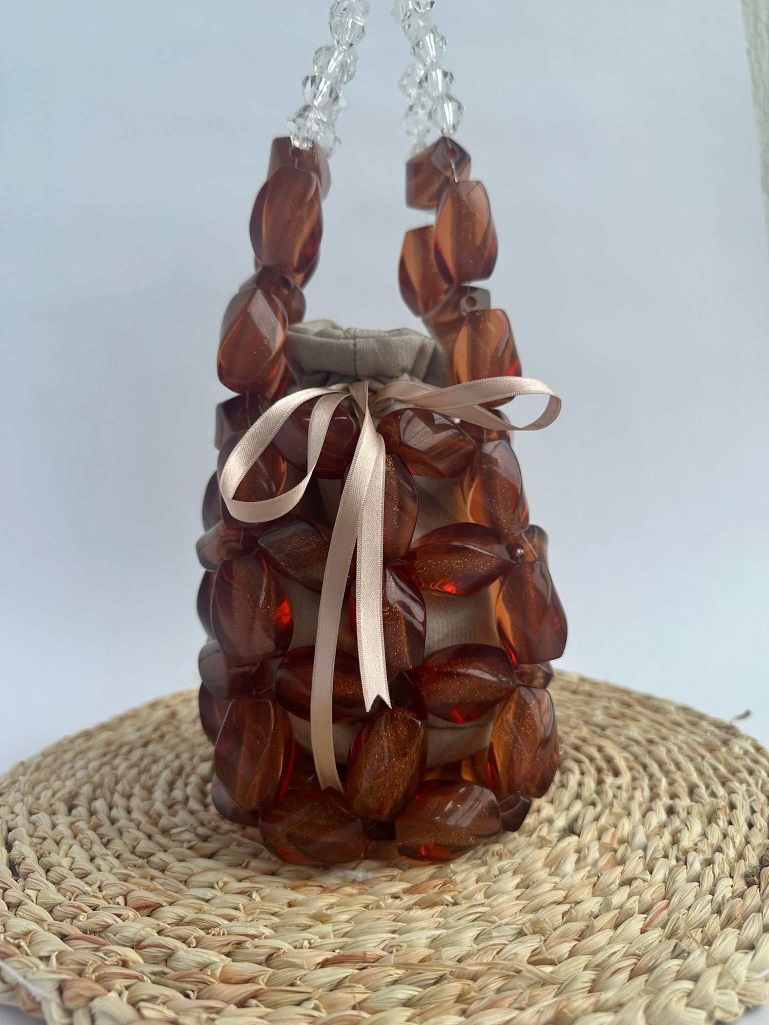 Bolso tipo canasta tejido con cuentas acrílicas. Tiene un bolso interno de tela que se ajusta con una cinta en moño y que puedes retirar si lo prefieres.