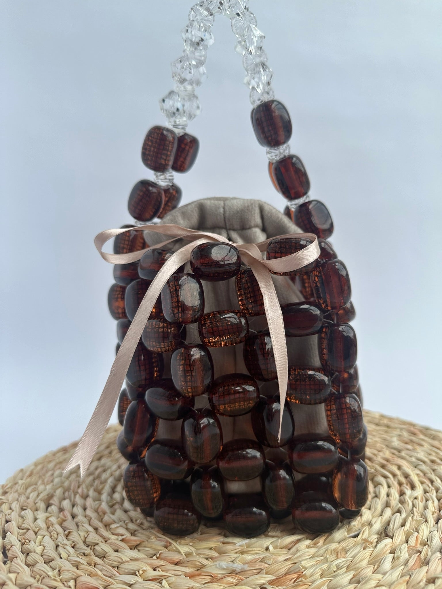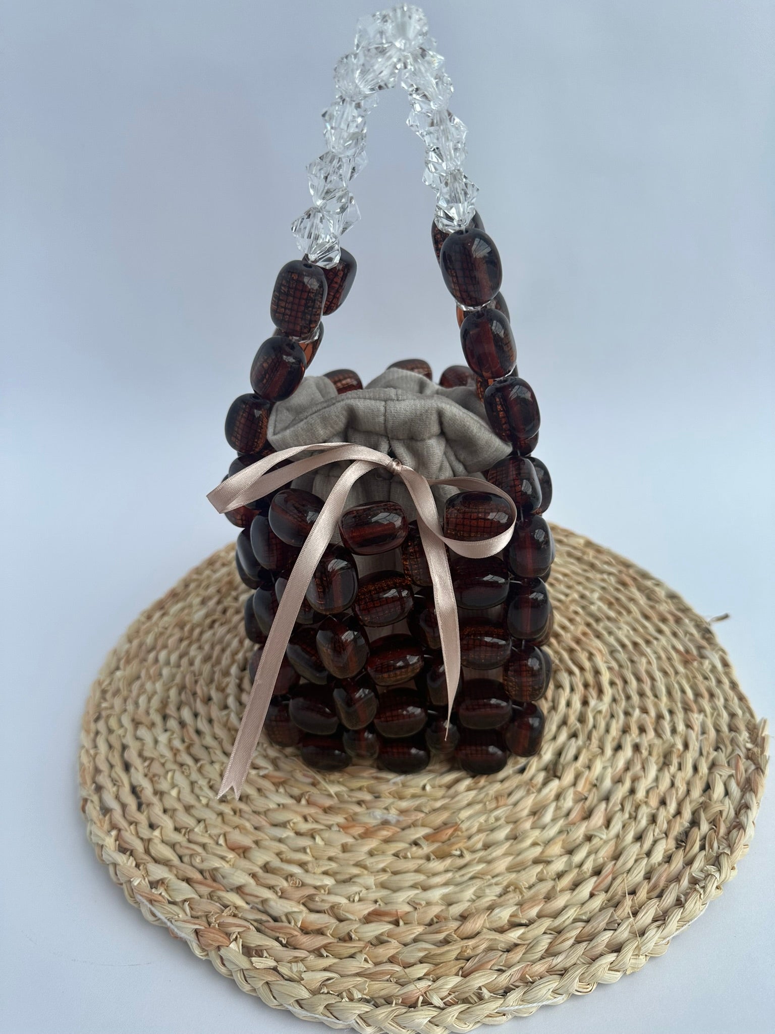 Bolso tipo canasta tejido a mano con cuentas acrílicas. Tiene un bolso de tela, interno y removible.